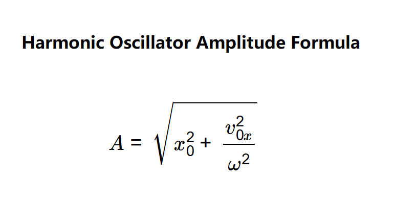 The formula for the amplitude of a harmonic oscillator is \( A = \sqrt{x_0^2 + \frac{v_{0x}^2}{\omega^2}} \), where \( A \) is the amplitude, \( x_0 \) is the initial displacement, \( v_{0x} \) is the initial velocity, and \( \omega \) is the angular velocity. The standard unit for amplitude is meters (m).